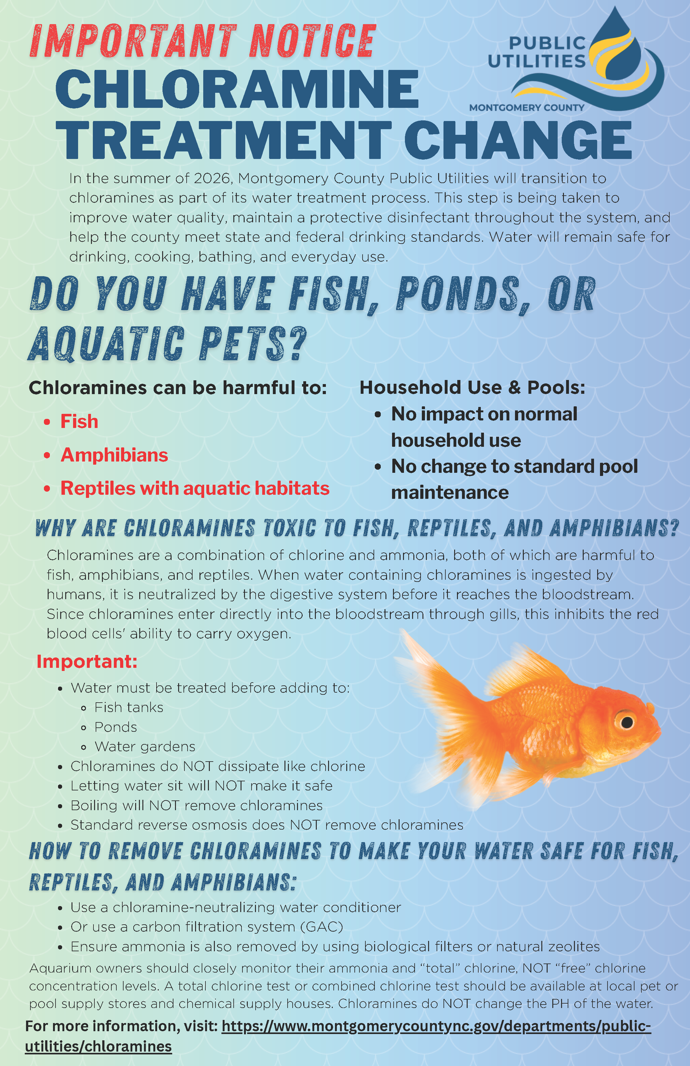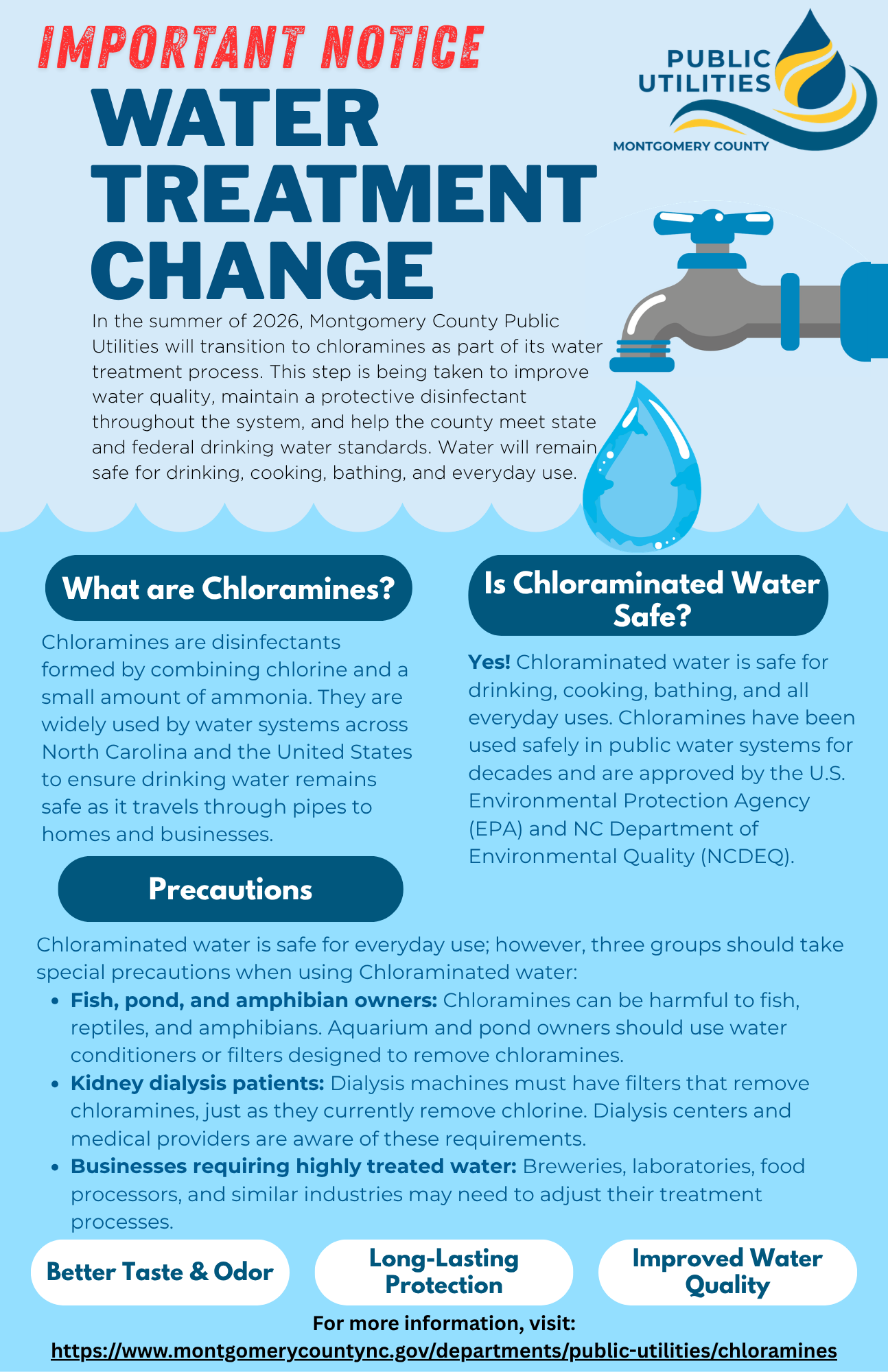 In the summer of 2026, Montgomery County Public Utilities will transition to chloramines as part of its water treatment process. This step is being taken to improve water quality, maintain a protective disinfectant throughout the system, and help the county meet state and federal drinking water standards.